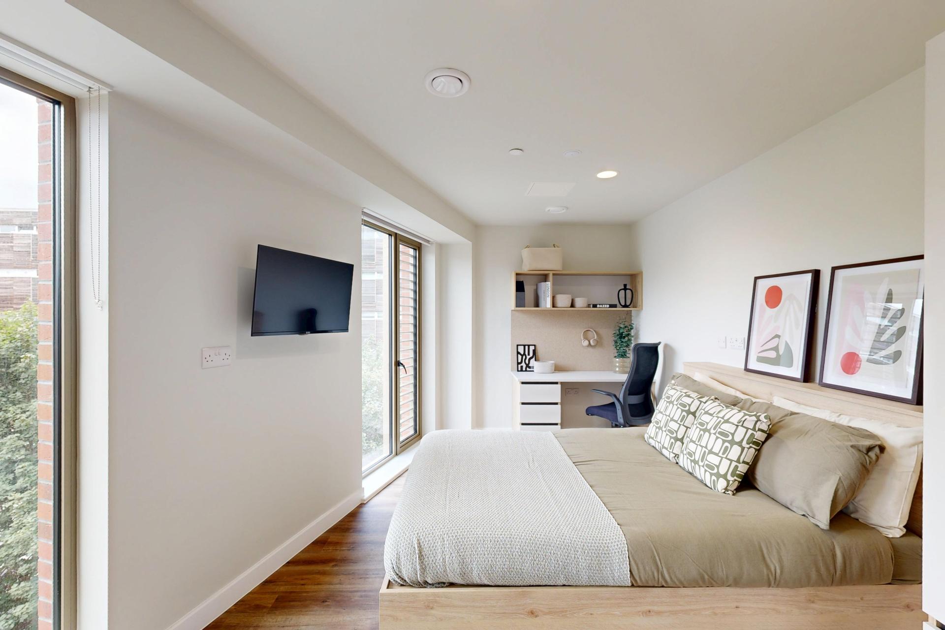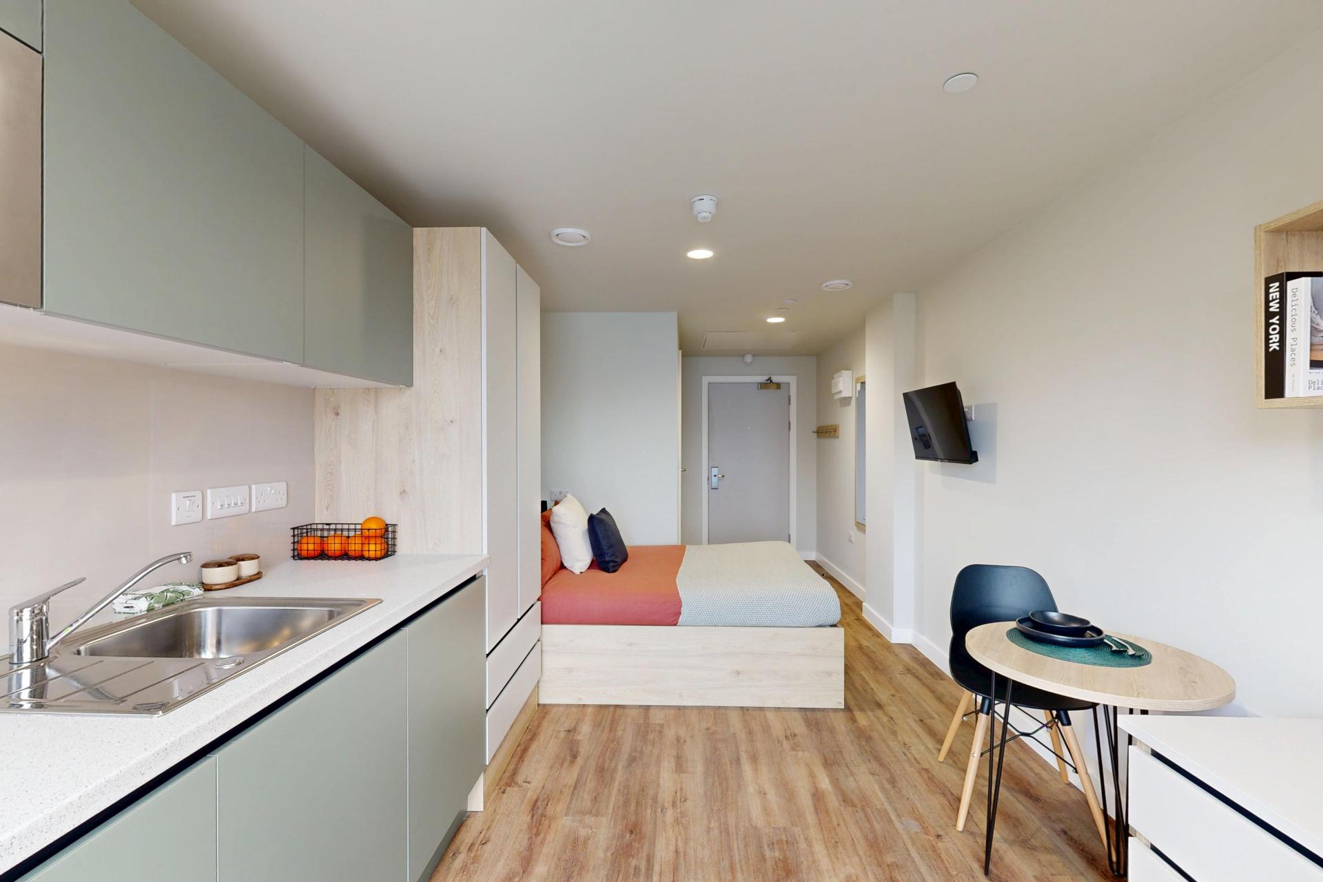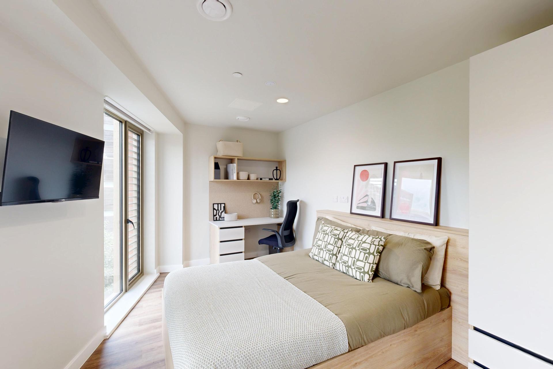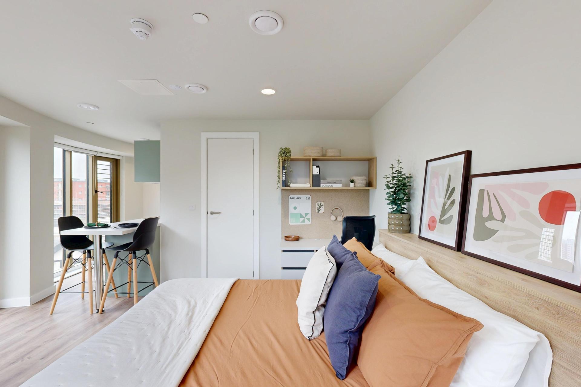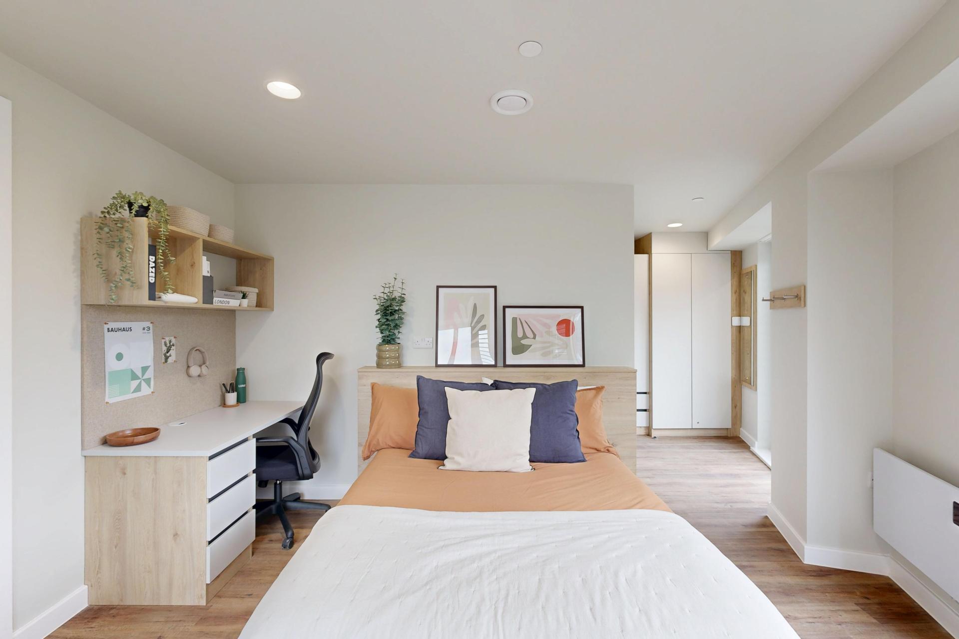 Inside, you’ll find a comfortable double bed, a generous wardrobe, and a dedicated study area to suit your needs. The modern kitchenette, complete with a full-size oven, makes meal prep simple, while the spacious en-suite bathroom ensures comfort and practicality for every resident.