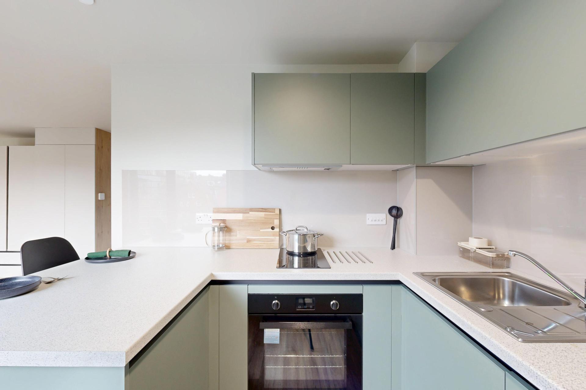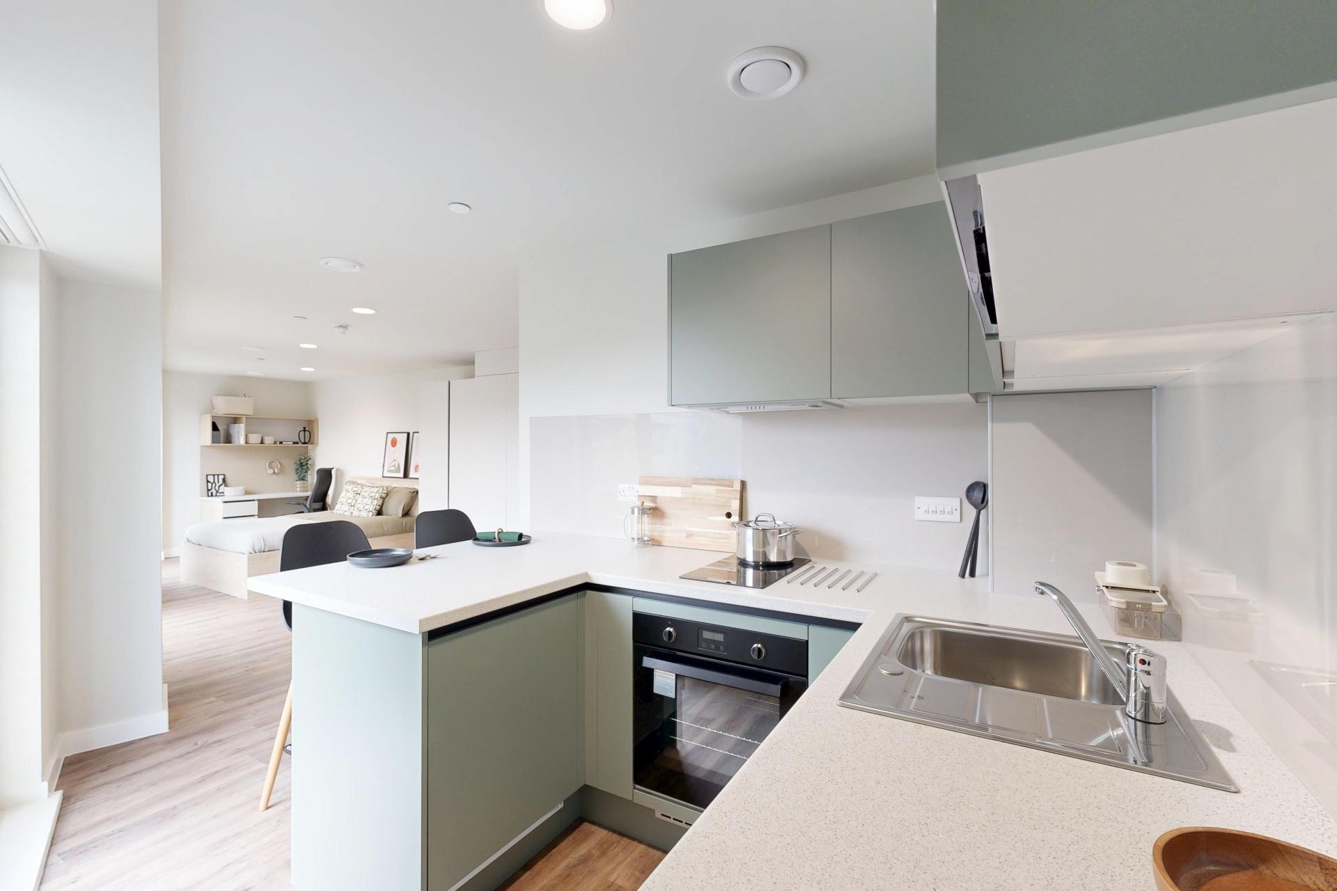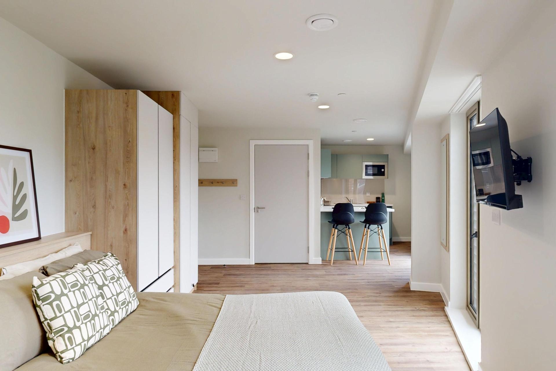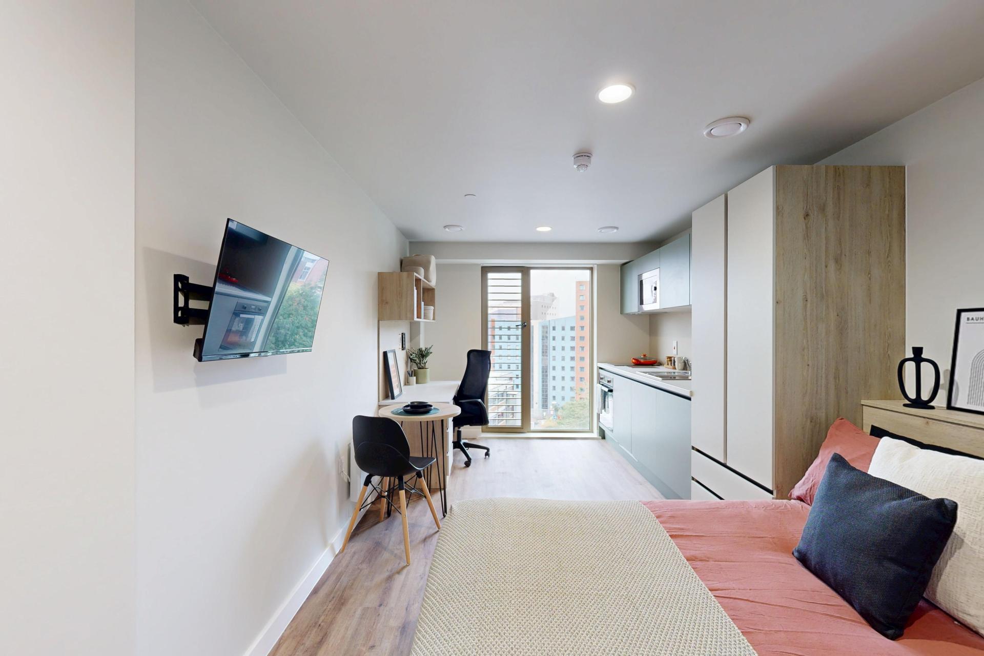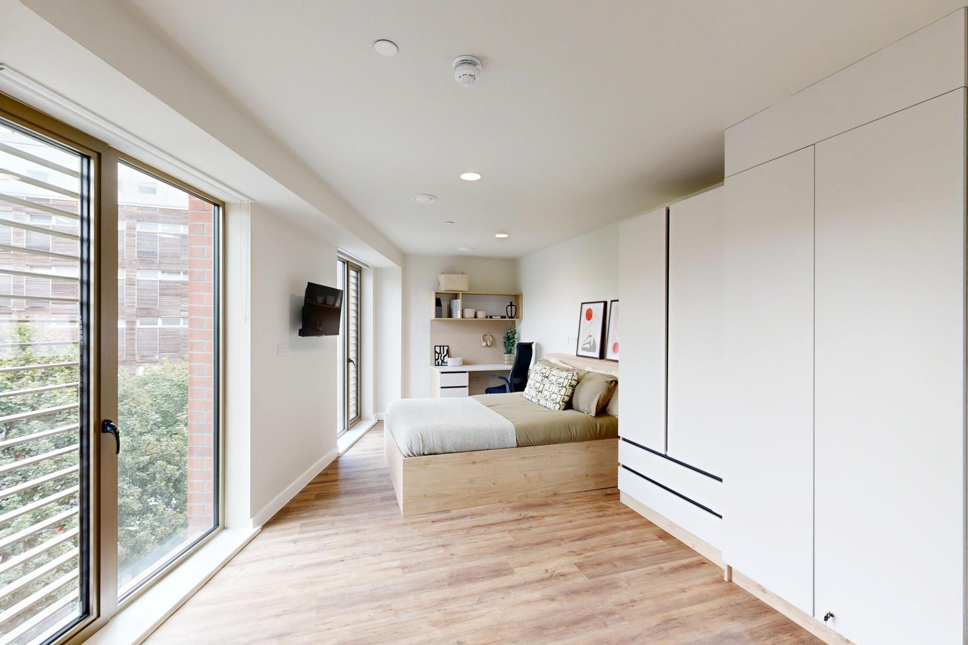 Inside, you’ll find a comfortable double bed, a generous wardrobe, and a dedicated study area to suit your needs. The modern kitchenette, complete with a full-size oven, makes meal prep simple, while the spacious en-suite bathroom ensures comfort and practicality for every resident.