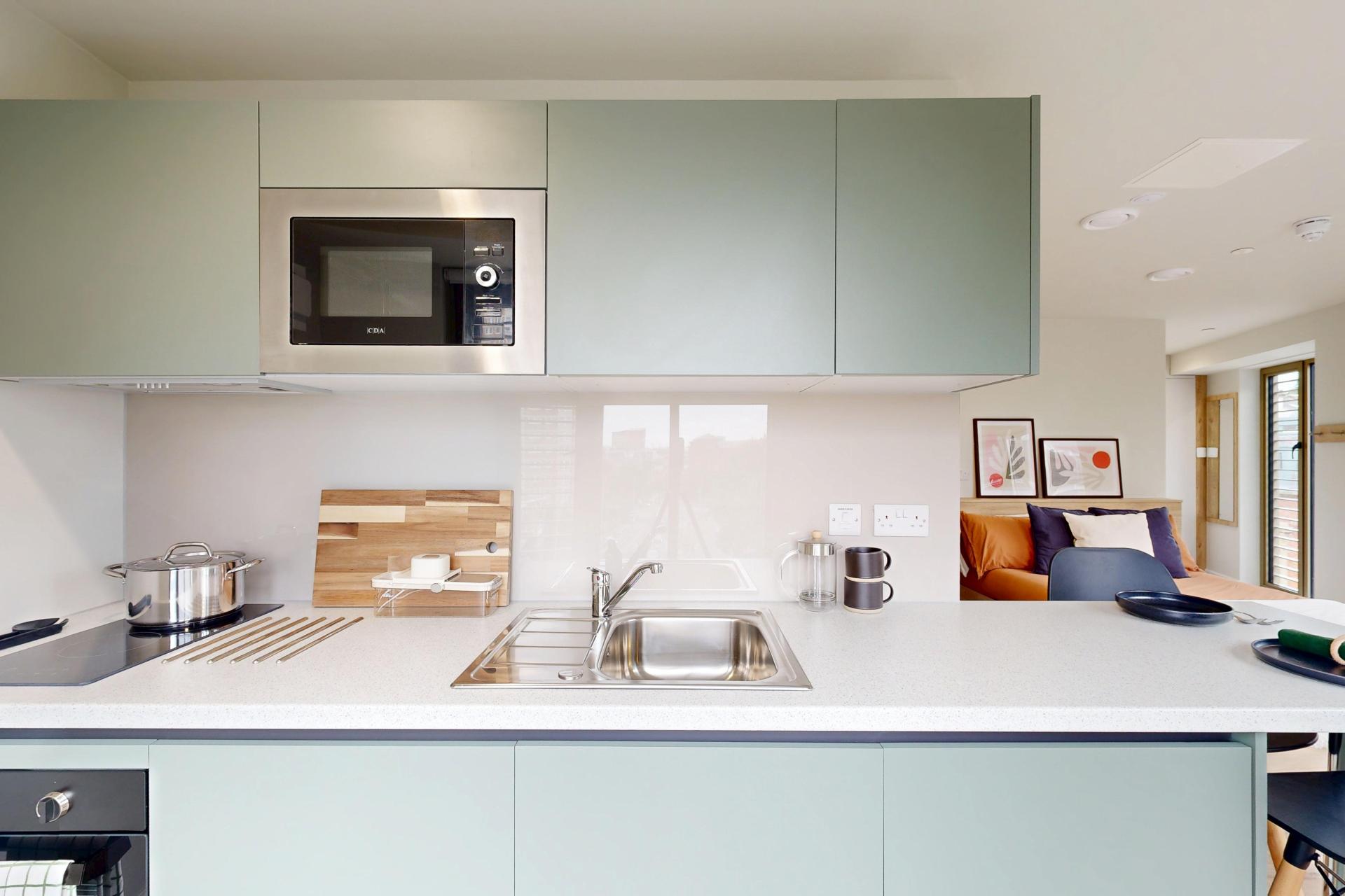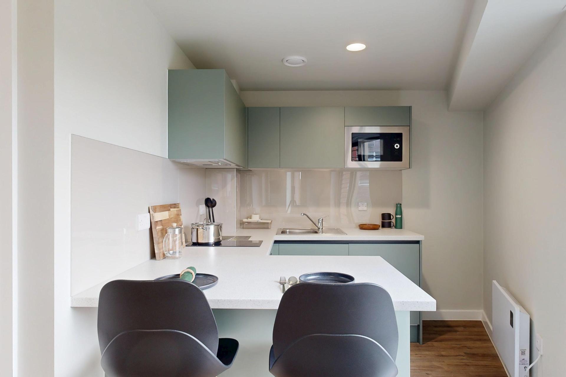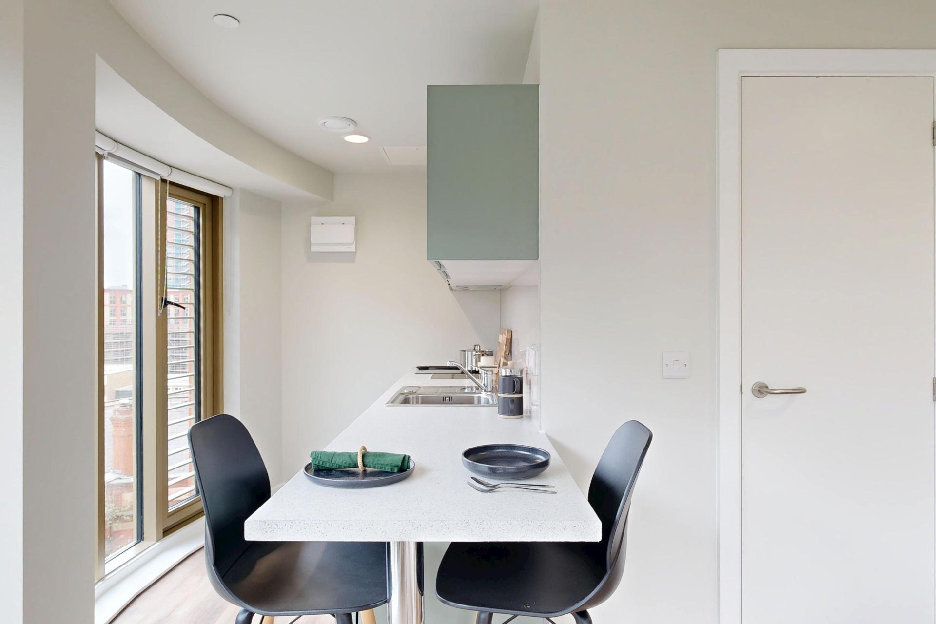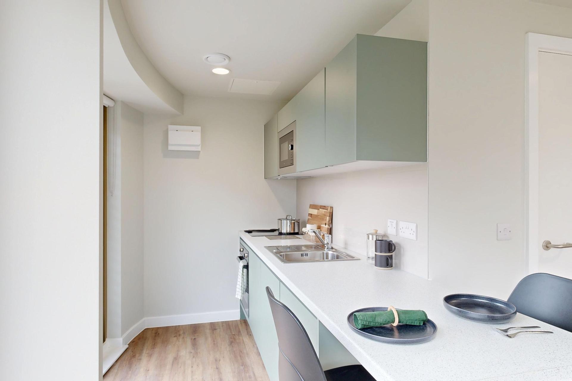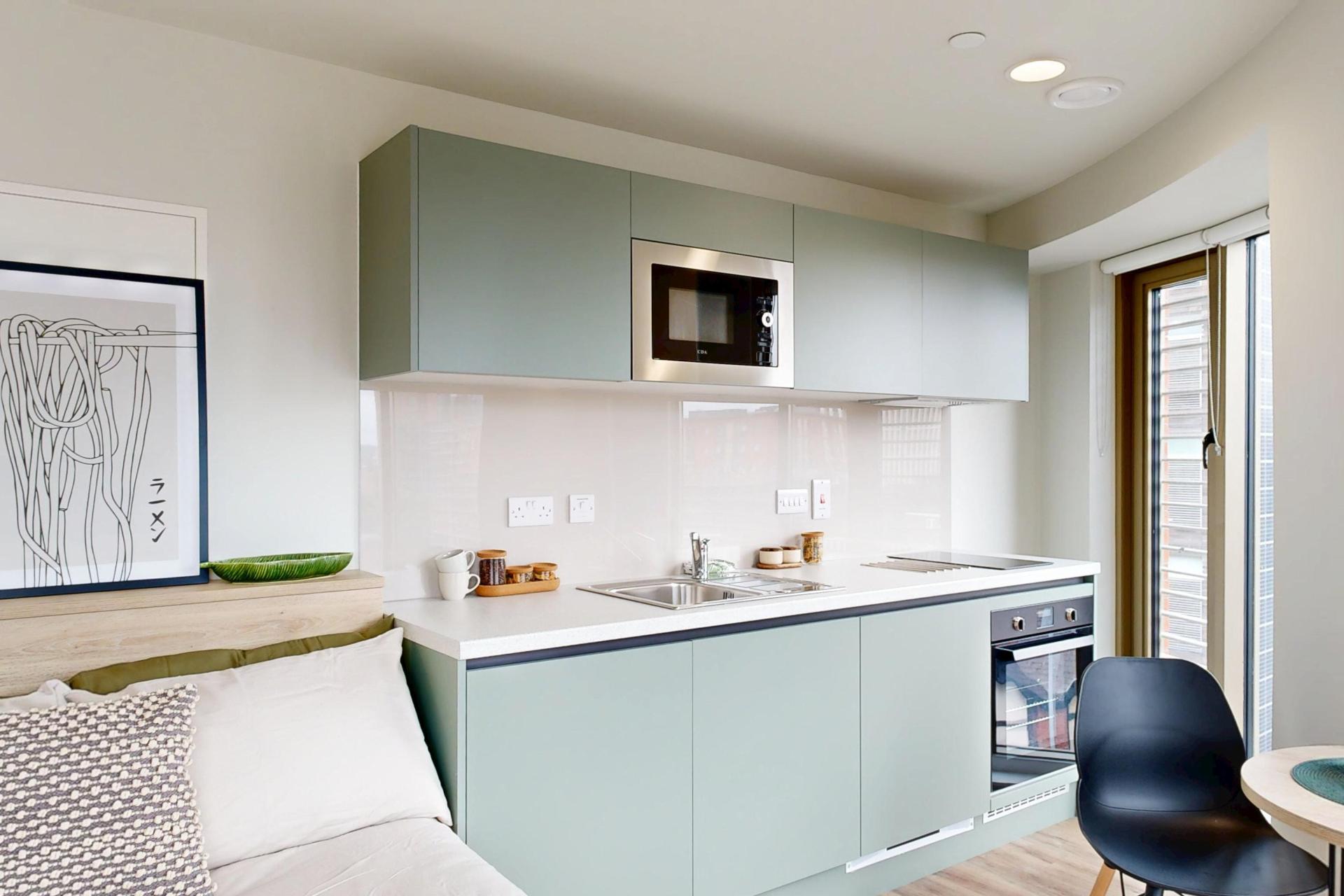 Inside, you’ll find a comfortable double bed, a generous wardrobe, and a dedicated study area to suit your needs. The modern kitchenette, complete with a full-size oven, makes meal prep simple, while the spacious en-suite bathroom ensures comfort and practicality for every resident.
